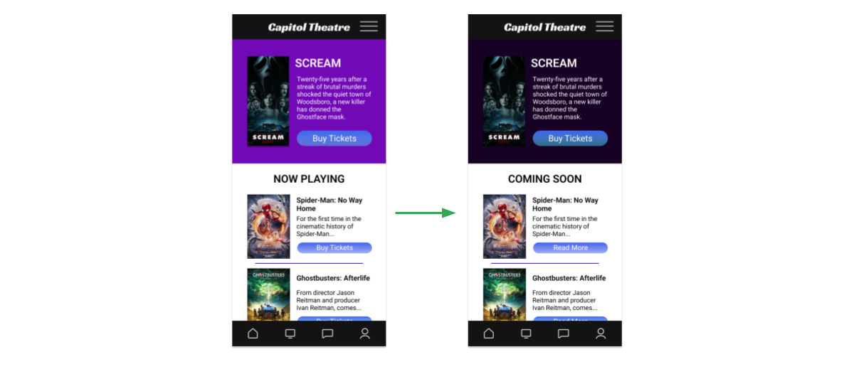 I found that the theater only has one movie at a time, and this helped out - because it would be less confusing on the home screen. The colors were a complaint as well, so I updated the home screen to reflect these changes.