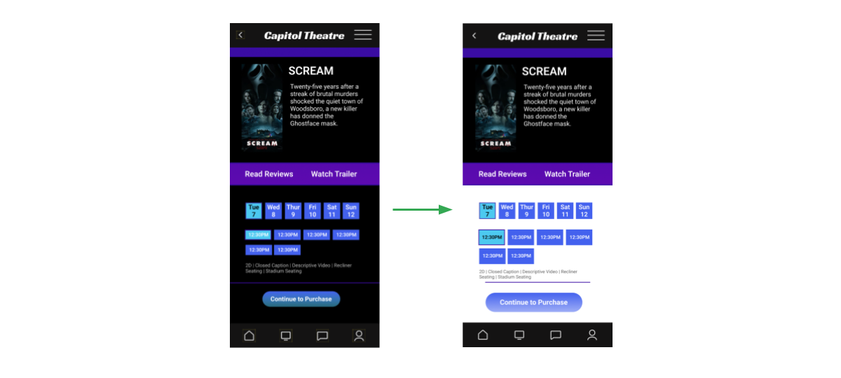 The "movie times" buttons were too small - these details were updated to make the app more pleasing to the eye and easier to use for many users.
